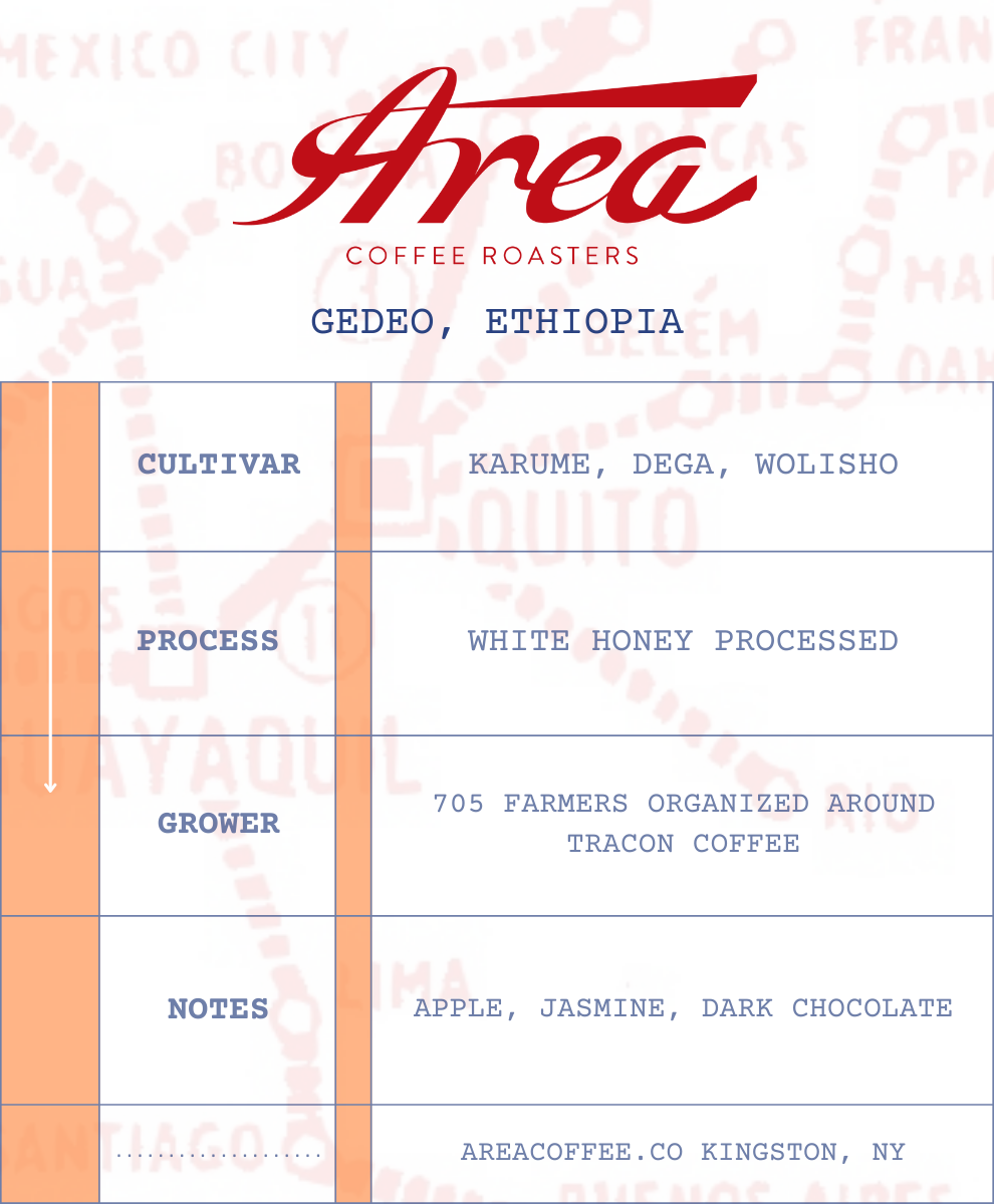This is a moderate intervention white honey processed coffee from Gedeo, Ethiopia, produced by smallholders organized around our processing and export partner, Tracon Coffee. The flavor profile is elegant and iconic of southern Ethiopia.